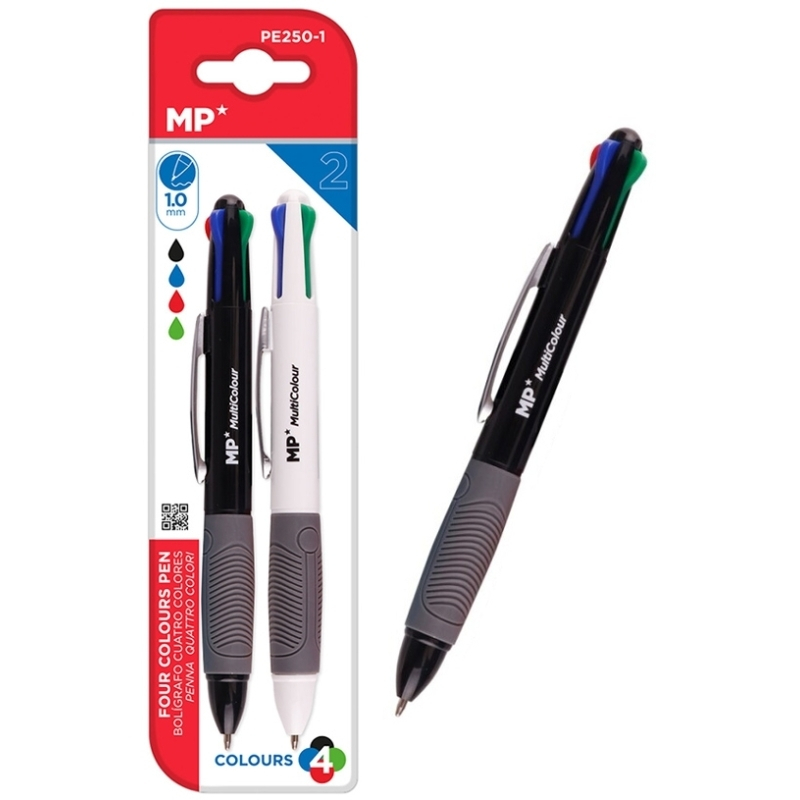 Στυλό διαρκείας της MP με μηχανισμό προώθησης και ανάκλησης, με 4 διαφορετικά χρώματα και μύτη πάχους 1mm.