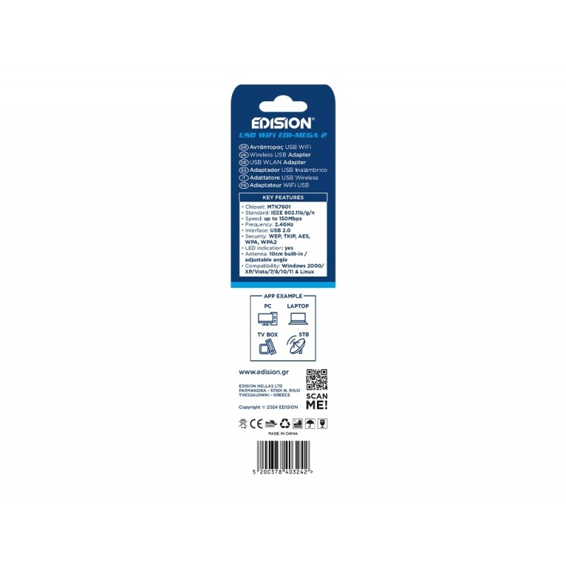 Το USB WiFi EDI-MEGA 2 της EDISION, είναι ένας Αντάπτορας USB Ασύρματου Δικτύου με ενσωματωμένη κεραία ρυθμιζόμενη ως προς την γωνία. Σας επιτρέπει να συνδεθείτε εύκολα και γρήγορα σε ένα ασύρματο δίκτυο, με υποστηριζόμενα πρότυπα IEEE 802.11b/g/n, ενώ είναι πλήρως συμβατό με λειτουργικά συστήματα Windows® 2000/XP/Vista/7/8/10/11 και Linux. Παρέχει την δυνατότητα να πετύχετε ταχύτητα μετάδοσης δεδομένων έως και 150 Mbps ενώ υποστηρίζει τις μορφές κωδικοποίησης WEP, TKIP, AES, WPA και WPA2.